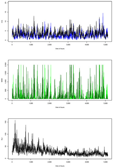 measured in EUR/. In Equation (32), the portfolio value is a random variable. It will be adopted as a summary index of the distribution of , the sample mean of the empirical probability distribution obtained in the Section 2. The additive shift in Equations (30) and (31) occurs for fluctuations in both wind energy production and wind speed. Following the analysis conducted in Section 1, there is an average decrease of EUR −0.005 per increase (all other conditions being equal) in the wind speed recorded at Nantes. Based on these results, we decided to ignore price fluctuations due to wind speed.