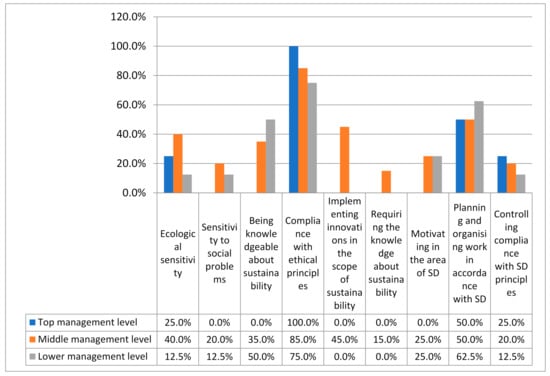 Figure 2 allows us to indicate the management level with the top percentage of managers who prefer most (score of 5) a given trait or activity of a sustainable manager. The managers in the top management level dominate in the case of the two following actions: compliance with ethical standards (100%) and controlling subordinates’ compliance with sustainability principles (25%). The managers in the middle management level gained an advantage with reference to 5 traits and actions: ecological sensitivity (40.0%), sensitivity to social problems (20.0%), implementing innovations in the scope of sustainability (45.0%), requiring subordinates to be knowledgeable about sustainability (15.0%), and motivating in the scope of sustainable development (25.0%). In the case of motivating, the same score is assigned to the lower management level (25.0%). The remaining two attributes of a sustainable manager that are especially preferred by the managers of the lower management level include being knowledgeable about sustainability (50.0%) and planning and organizing work in accordance with sustainability principles (62.5%).