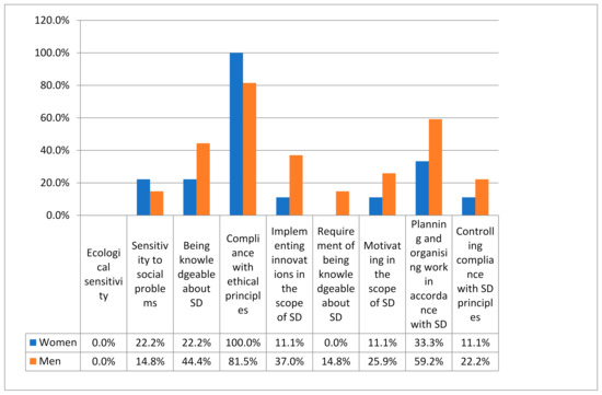 As Figure 3 demonstrates, a high correlation of views of men (29.6%) and women (33.3%) pertaining to the most desirable (score of 5) traits and actions of a sustainable manager occurs only in the case of ecological sensitivity. The greatest differences in the views occur for such traits and actions as planning and organizing work in accordance with sustainability principles (men—59.2%, women—33.3%), implementing innovations in the scope of sustainability (men—37.0%, women—11.1%), and being knowledgeable about sustainability (men—44.4%, women—22.2%). As the data demonstrate, women attach less importance to all three abovementioned attributes of a sustainable manager.