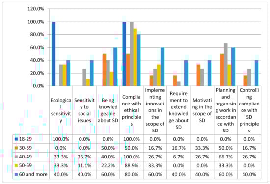 It is also worth analyzing the differences in views pertaining to the most desirable traits and actions of a sustainable manager with regard to the age of the mangers. This problem is illustrated in Figure 4.