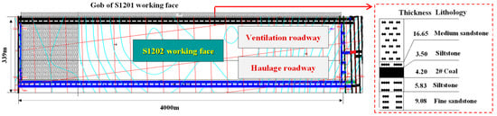 Ningtiaota Coal Mine is located in Western China, with a design annual output of 20 Mt/a, which is a typical 10 million ton modern mine. The strike length of the S1202 working face of the mine is 4000 m, and the dip length is 339 m. The main mining is 2-2 coal, the average coal thickness is 4.2 m and the average buried depth is 162 m. The basic roof of the working face is mainly fine sandstone with an average thickness of 16.65 m; the immediate roof is mainly siltstone, with an average thickness of 3.50 m; the immediate floor is mainly siltstone, with an average thickness of 5.83 m; and the basic floor is mainly fine sandstone with an average thickness of 9.08 m. The rock stratum of the working face is shown in Figure 1.