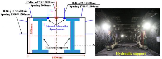 The roadway is designed as a rectangular section, with a clear width of 5800 mm and a clear height of 3500 mm. In terms of the active support of the roadway, the bolt mesh support was adopted for the haulage roadway and ventilation roadway. The roof bolt was Φ 22 × 2500 mm, row spacing 1700 × 1000 mm, and the roof anchor cable was Φ 17.8 × 7000 mm, spacing 3000 mm. In terms of the advance passive support of the roadway, ZTC10696/27/50 advance hydraulic support was adopted for the haulage roadway and ventilation roadway, with the working resistance of 0.1 MPa. The specific support parameters are shown in Figure 2.