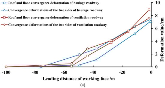(1) With the advance of the working face (−100 m~0 m), the roof and floor convergence and convergence deformation of the 2 sides show an increasing trend. In the whole advance process, the maximum value of the roof and floor convergence deformation is 7.4 cm, and the convergence deformation of the 2 sides is 7.1 cm in the haulage roadway, as shown in Figure 3a. The maximum value of the roof and floor convergence deformation is 8.9 cm, and the convergence deformation of the 2 sides is 7.6 cm in the ventilation roadway. The above data show that the deformation of the roadway surrounding rock can meet the requirements of safety production during the service period of the whole working face.