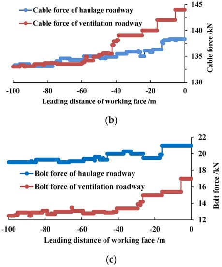 A comprehensive monitoring section is arranged 100 m in front of the haulage roadway and ventilation roadway to monitor the displacement of roadway surrounding rock and the force of the supporting components within the whole advance pressure influence range, as shown in Figure 2. The specific layout of the monitoring section was as follows: infrared anchor dynamometers were installed at the end of roadway roof cables and bolts to continuously monitor the force change of the supporting components. Displacement monitoring points were arranged at the roadway roof, roadway floor and the middle of the two sides to continuously monitor the roof and floor convergence deformation and convergence deformation of the two sides. The displacement change curve of the roadway surrounding rock within the whole advance pressure influence range is shown in Figure 3a, the force change curve of the anchor cable is shown in Figure 3b and the force change curve of bolt is shown in Figure 3c. The “-” of the abscissa in Figure 3 represents the front of the working face, that is, the advance working face.