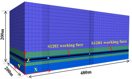 A numerical calculation model consistent with the field conditions is established, and the calculation range is 480 m × 200 m × 200 m (length × wide × high) by FLAC 3D, as shown in Figure 4. The bottom of the model is fixed, the side restricts the horizontal movement, and the initial stress is applied to make the test face reach the in situ stress level. The Mohr Coulomb constitutive model is adopted for the surrounding rock, cable and bolt are simulated using the cable element, and the uniform load is adopted for simulating the advanced hydraulic support. The physical and mechanical parameters of each rock stratum are shown in Table 2.