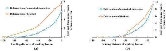 Comparison curve between the numerical test and field test. (a) Deformation of the haulage roadway. (b) Deformation of the ventilation roadway.