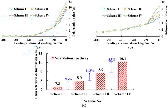 ③ The characteristic deformation of the haulage roadway of each scheme is 4.5 cm, 5.2 cm, 6.0 cm and 7.1 cm, respectively. With the decrease in the support force of the advance support, the increased rates of the characteristic deformation are 15.5%, 15.4% and 18.3%, respectively, as shown in Figure 6c. It shows that the deformation of the surrounding rock of the haulage roadway increases the most when 1/3 support force decreases to 0 support force. However, the characterization deformation is only 7.1 cm, which meets the requirements of safe production, which provides support for the field support system without advance support.