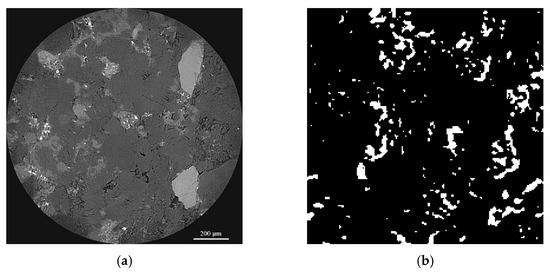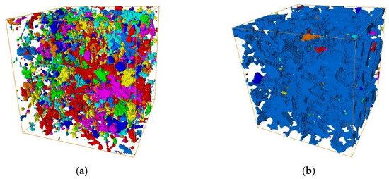 In this study, the threshold method was used to binarize the three-dimensional gray image obtained by X-ray CT scanning (Figure 1a). The threshold method is a traditional image segmentation method. Its advantages are simple implementation, a small amount of calculation, and relatively stable performance. Therefore, it has become the most basic and widely used segmentation technology in image segmentation. Image threshold segmentation technology makes use of the difference in gray value between the target to be extracted and its background in the gray image. If the image is regarded as a combination of two types of regions with different gray levels—the target and background—an appropriate threshold is selected to determine whether each pixel in the image should belong to the target region or the background region, so as to convert it into the corresponding binary image. Figure 1b shows the binary image of Y288-10.