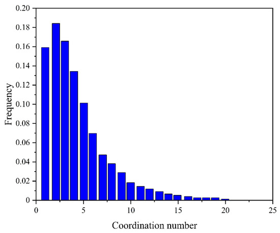 The maximum ball method adopts a clustering algorithm, and the pore space of a two-dimensional image can be fully represented by the maximum ball set. In order to analyze the topology of pore space, the largest ball needed to be fused into clusters. Firstly, for each pixel of the pore space, we searched the pixels around the point, then determined whether there were rock particles in the pixel. If there were no rock particles, we increased the search radius. When it came into contact with the rock particles, we determined the maximum ball corresponding to the pixel, and calculated the lower and upper limits of the maximum ball radius. Each pixel located in the pore space had a largest ball, but many of the largest balls were completely contained in other balls. These balls were redundant were, therefore, removed. According to the position of the center of the largest ball and the upper and lower limits of the radius, the repeated largest ball was cleared. In this way, different maximum ball clusters were formed. The size of the largest ball set was sorted. When two large balls connecting clusters were in contact, the smallest ball in contact was the throat. The two large pores were considered to be connected, and the coordination number of the two large balls was increased by one. After the cycle, the coordination number of the local largest ball (pore) was determined [53]. The distribution of coordination numbers is shown in Figure 5.