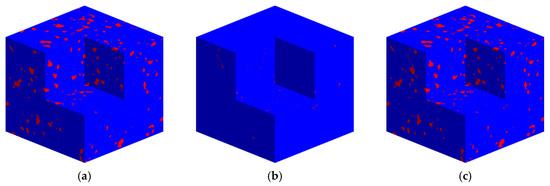 The digital rock model of 600 × 600 × 600 was constructed by using mercury injection, nuclear magnetic resonance, and cast-thin section data, with a resolution of 0.433 μm. The porosity was 0.22%, which was due to the loss of most of the micro-pores when the digital rock was constructed by the X-ray CT method. The microporous digital rock was superimposed with the CT scanned digital rock by voxel through the multi-scale fusion algorithm. Skeleton voxels are still skeleton voxels after superposition. In other superimposed cases, they were all pore voxels. After the superposition, a high-resolution 3D digital rock was generated. Figure 6a is the Y288-10 digital rock constructed by X-ray CT scanning, and Figure 6b is the microporous digital rock constructed by mercury intrusion, nuclear magnetic resonance, and cast-thin section methods. Figure 6c is a high-resolution 3D digital rock with a complex pore structure constructed by stacking the CT scanning digital rock and micro-pore digital rock obtained in the first two steps. The digital rock porosity obtained by superposition is 6.27%, which is closer to the experimental porosity of the Y288-10 core of 6.40%, with a relative error of 2.03%. The absolute permeability of the high-resolution digital rock, obtained by lattice Boltzmann calculation superposition, is 0.06 mD, and the experimental permeability of core Y288-10 is 0.05 mD; therefore, the calculated results are in good agreement with the experimental results. The high-resolution digital rock constructed by the combination of micron CT scanning and mercury injection, NMR has greatly improved porosity and permeability, which are closer to the experimental results, and which verify the feasibility of this innovative method.