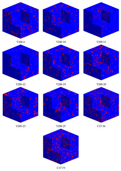 In order to verify the accuracy and versatility of this method, 10 tight sandstones were scanned by X-ray CT, including Y288-4, Y288-10, Y288-11, Y288-12, Y288-19, Y288-20, Y288-23, Y288-27, C17-16, and C17-73. A multi-scale three-dimensional digital rock was constructed by using the digital core construction method with a complex pore structure. The digital rocks with complex pore structure are shown in Figure 7.