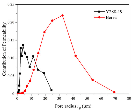 According to the CT scanned digital rock, the probability of pore radius is counted according to the logarithmic interval, and the pore radius distribution of the core can be obtained. According to the pore radius distribution, the permeability contribution curve could be expressed by Equation (6) [54]: