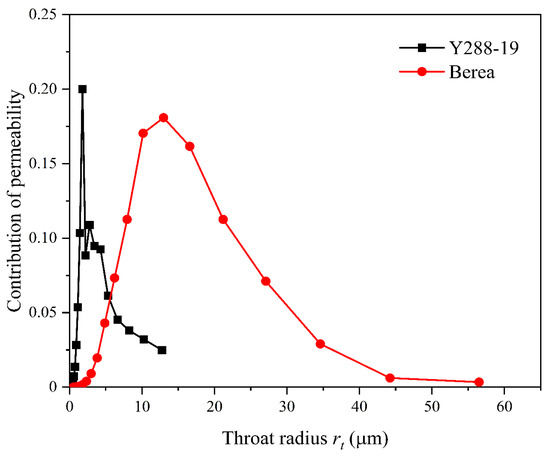 Throat radius distribution and absolute permeability contribution curve of two types of cores.