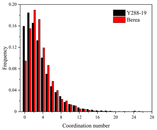 It can be seen from Figure 11 that the overall coordination number of tight sandstone Y288-19 is significantly smaller than that of homogeneous sandstone Berea, indicating that the pore connectivity of tight sandstone is poor, which is also an important reason for the low permeability of tight sandstone.