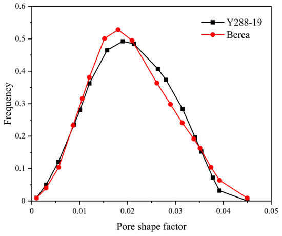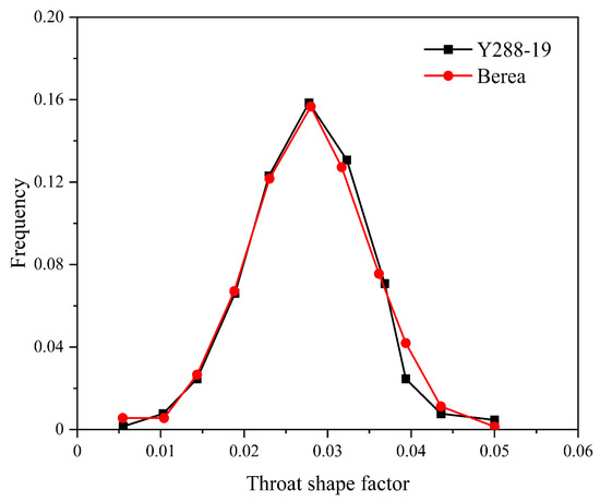 It can be seen from Figure 12 and Figure 13 that the shape factor of tight sandstone Y288-19 is slightly smaller than that of homogeneous sandstone Berea, but it is basically the same. It indicates that the roundness of the pore-throat shape of tight sandstone is slightly worse than that of homogeneous sandstone. In general, the pore-throat shape of tight sandstone has a negligible influence on the electrical characteristics and seepage characteristics of rock compared with homogeneous sandstone Berea. The resistivity index under different water saturations was calculated by the finite-element method; then, the electrical property difference between tight sandstone Y288-19 and homogeneous sandstone Berea was studied.