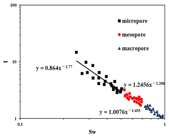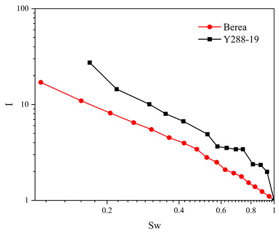 I-Sw curve of tight sandstone Y288-19 and homogeneous sandstone Berea is shown in Figure 14. It can be seen that the homogeneous sandstone Berea satisfies the Archie phenomenon, while tight sandstone is not simply linear on the I-Sw double logarithm curve. This phenomenon is mainly caused by the small radius of the maximum connected pore-throat of tight sandstone and the complex structure of the pore throat [58].