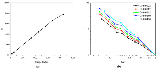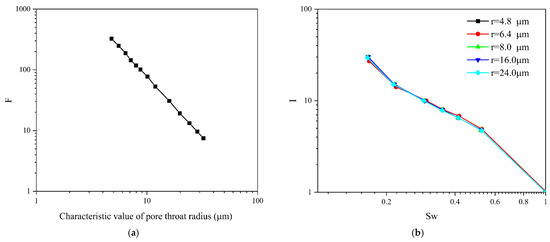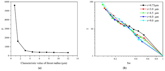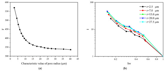 In order to analyze the influence of pore size on rock electrical properties, the characteristic values of the pore radius were selected, other parameters were kept unchanged, and the pore size distribution was changed in multiples, then transformed into digital rocks with different pore sizes after discretization. In order to eliminate the influence of formation-water resistivity, the finite-element method was utilized to solve the formation factors of digital rocks with different pore sizes. The relationship curve between different pore radius eigenvalues and formation factors of the core is shown in Figure 16a. It can be seen from the figure that, with an increase in the characteristic value of the pore radius, the curve can be divided into two parts. The formation factors decrease rapidly at first, then tend toward a stable value. In the first part, due to the increase in pore space, the conductivity of rock is increased and the formation factor is reduced; The second part tends to be stable because the size of the throat remains unchanged. Although the characteristic value of the pore radius is increased and the resistance of the pore part is very small, the resistivity of the throat part connected in series with it remains unchanged. Therefore, the resistivity of the whole rock is basically unchanged, and the formation factors are also unchanged.