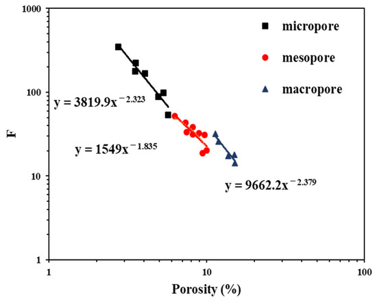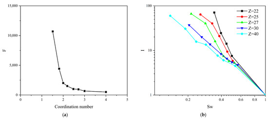In order to analyze the influence of throat size on rock electrical properties, the eigenvalues of the throat radius were selected. It can be seen from Figure 17a that with an increase in the characteristic value of the throat radius, the curve can also be divided into two parts. The formation factors first decrease rapidly, then tend to a stable value. In the first part, due to increase in the throat space, the rock conductivity increases and the formation factor decreases; The second part tends to be stable because the increase in throat has exceeded the pore size, the pore resistance remains unchanged, and the pore has become the main factor controlling the rock resistivity.