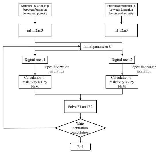 where, Rt is the equivalent resistivity of rock (Ω·m); Rw is formation water resistivity (Ω·m); φ is formation porosity (%); Sw is water saturation (%); a, b, m1, m2, m3, n1, n2, n3 are constants; F1 and F2 are the proportion of parallel and series, respectively; C is the regional constant; and the initial parameter is set as 5.6, which affects the values F1 and F2 of the digital core simulation.