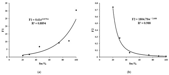 Relationship between weight coefficient and water saturation: (a) relationship between weight coefficient F1 and water saturation; (b) relationship between weight coefficient F2 and water saturation.