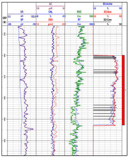 It can be seen from Figure 26 that the oil saturation obtained by using the three-component automatically mixed conductivity saturation model is more consistent with the core analysis value compared with the Archie formula oil saturation result. The average absolute error is reduced from 13.40 to 8.09, and the accuracy is improved by 5.31; The average relative error is reduced from 16.1% to 9.56%, and the accuracy is improved by 6.54%, which proves that the three-component automatically mixed conductivity saturation model has good applicability. The conclusion of the new model is more accurate, especially in the 3461.4 m–3492.4 m interval. The average oil saturation explained by the three-component automatically mixed conductivity saturation model is 77.6%, and the interpretation conclusion is the oil layer. After the perforation oil test, the initial daily oil production is 4.4 t and water production is 0.3 t. The oil test conclusion is the oil layer, which is the same as the interpretation conclusion.