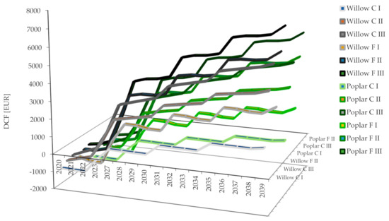 Figure 1 illustrates discounted cash flows for willow and poplar chip production depending on the soil fertilisation option and subsidy scenario. The highest DCF values were calculated for willow F III (EUR 7236), followed by poplar F III (EUR 6064), and then willow F II (EUR 5984) and willow C III (EUR 5641), confirming that a chance to receive payments has a considerable influence on the profitability of production, as reflected by from the willow F variant achieving over double revenue values. The strongest effect of payments on revenues, leading to an over 7-fold increase for poplar and a 3.6-fold increase for willow, was demonstrated in the C variants (without fertilisation). The above results are particularly important in terms of persuading farmers to consider low-input SRC cultivation, which has a much less intensive impact on the environment, preventing the adverse and high influence of fertilisation on the natural environment, particularly in terms of causing freshwater eutrophication by poplar plantations [43] or freshwater toxicity caused by willow plantations [44], although higher external costs incurred by fertilisation (as much as 23% more for willow production [45] and 20% for poplar production [46]) should not be neglected. The highest DCF values were also recorded on the willow F III and poplar F IIII plantations and were over 2- and 3-fold higher than they were for the willow F I and poplar F I variants.