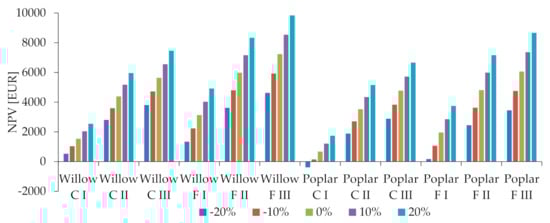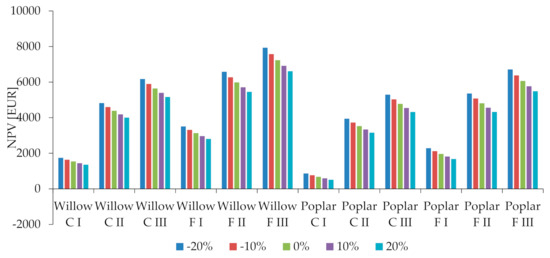 When comparing the economic situation in Poland in 2013–2015 [9] with the situation in 2020, the experimental data demonstrated a decline in the NPV: for willow C I, a decline from EUR 1653 to EUR 1540 was experienced, and for willow F I, a decline from EUR 3298 to EUR3135 was experienced; for poplar F I, there was a decline from EUR 2111 to EUR 1964, which represented a decline of 5%, and for poplar C I, there was a decline from EUR 844 to EUR 680, which was nearly 20%.