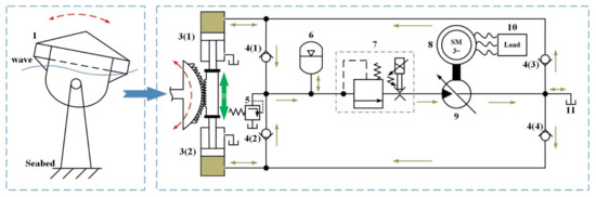 Some European countries were the first to carry out the research of wave energy conversion technology. At present, a large number of wave energy conversion devices have been designed and manufactured, some of which have been tested in actual sea conditions [2]. The wave energy converters are usually composed of a wave energy capture (WEC) system and a power take-off (PTO) system. There are many ways to classify wave energy converters currently, according to the different working principles of wave energy captures. They can be mainly divided into three types, the oscillating water column, overtopping, and oscillating body [4]. The role of the WEC system is to absorb wave energy, while the role of the PTO system is to convert the energy captured by the WEC system into relatively consistent mechanical energy and then outputs electrical energy through the generator. Therefore, the PTO system is the core part of the wave energy converter. There is no doubt that it has become the research focus of many universities and energy institutions [5]. In general, the typical PTO system can be equipped with four types of drive mechanisms including air turbines, low-head hydraulic turbines, linear generators, and hydraulic oil circuits [4,5,6]. Air turbines are mainly adopted in oscillating water column WEC due their special working principles [4]. Their structures are reliable, however, the compressibility of air and the inevitable deviation of the actual rotation speed to the optimal value may easily degrade their efficiencies [7,8]. With high efficiency and reliability, low-head turbines are mainly applied to overtopping devices. Nevertheless, their large-scale applications are still impeded by the inconvenient constructions of the overtopping WECs. The linear generators are also broadly utilized in WECs, which primarily benefits from their low mechanical complexity. However, the linear generator structures are vulnerable to damages from vibrations and impacts, especially in real irregular waves and extreme waves. In addition, the power outputs from the linear generators fluctuated, and consequently, the quality of the converted electricity cannot satisfy the criteria. In contrast, hydraulic PTO systems are frequently employed in oscillating body WECs, and they use hydraulic oil circuits to transmit energy, which can cope with low frequency-large torque inputs of waves and overload protection. Meanwhile, their advantages of stabilizing power output are attractive for engineering applications. However, the performances, e.g., the pressure consistency, the flow rate consistency, and the efficiency of the hydraulic PTO, are sensitive to operating conditions, and the aforementioned performances may significantly deteriorate when the system states deviate from the optimal states. Consequently, we focus on hydraulic PTO in this paper and investigate the influences of several key elements to their performances [9,10].