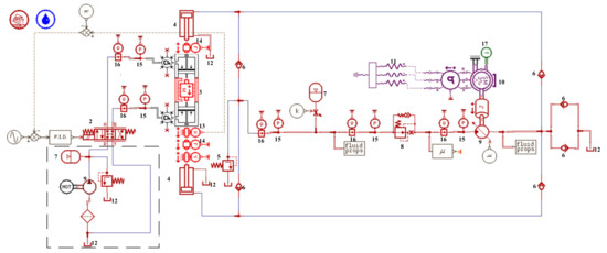 The hydraulic PTO system simulation model was established in AMESim, a software used for the modeling, simulation, and dynamic analysis of hydraulic systems, it is shown in Figure 2. The parameters for the simulation model are based on the design of the experiment platform and are shown in Table A1 of Appendix A.
