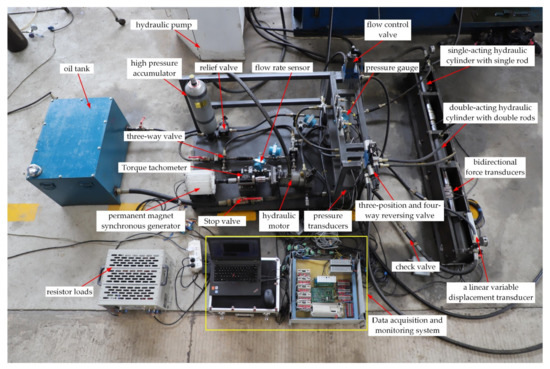 The verification test was completed by building a hydraulic PTO system prototype platform, shown in Figure 3, which consists of a drive system, a hydraulic PTO system, a data acquisition and monitoring system, and loads. The drive system, which simulates the motion of the wave energy capture device, realizes the reciprocating motion of the piston in the double-hydraulic-chamber double-rod cylinder through a hydraulic pump station and controls the direction of the piston by adjusting the three-position and four-way reversing valve, which guides the high-pressure oil into different chambers, and finally achieves the input of wave energy at different periods. The hydraulic PTO system utilizes the reciprocating movement of two single-acting hydraulic cylinders with single rods that are solidly connected to the double-acting hydraulic cylinder with double rods to discharge high-pressure oil from the rod-less cavity of the cylinders. The check valves integrate the two-way flow of hydraulic oil into a one-way flow, and then hydraulic oil enters the hydraulic motor through the flow control valve to drive the generator, which is rigidly connected with the motor to rotate. This process realizes the conversion of mechanical energy to electrical energy. The monitoring and control system was developed based on the LabVIEW software. A human-computer interaction interface was established in LabVIEW, and the serial communication technology of the computer and the programmable controller was applied to realize the condition monitoring of the PTO system and the real-time collection of data such as tubing pressure, system flow, hydraulic oil viscosity, and hydraulic motor speed and system while realizing the storage of data by using the database system.