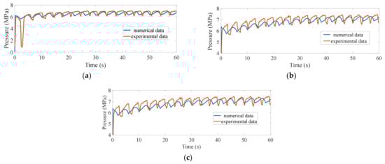 Comparison and experiment of hydraulic PTO system pressure between simulation at different temperatures. (a) ambient temperature is 6 °C. (b) ambient temperature is 12 °C. (c) ambient temperature is 18 °C.