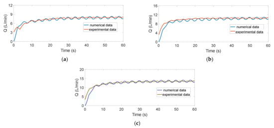 Comparison of hydraulic PTO system flow between simulation and experiment at different temperatures. (a) ambient temperature was 6 °C. (b) ambient temperature was 12 °C. (c) ambient temperature was 18 °C.