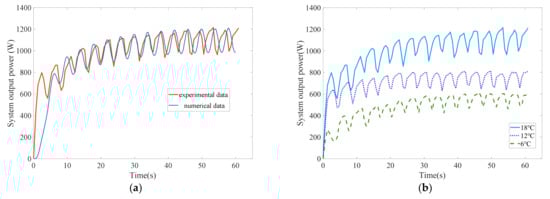 System output power at different start-up temperatures. (a) comparison of system output power at 18 °C between the numerical model and experimental conditions. (b) comparison of system output power at 6 °C, 12 °C, and 18 °C.