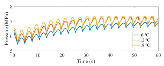 The wave with a period of 8 s and an amplitude of 0.075 m was used to carry out the simulation and experiments. The pressure changes of the hydraulic PTO system within one minute of the startup process are shown in Figure 4. The three pictures (a), (b), and (c) respectively represent the corresponding system flow when the startup temperature is 6 °C, 12 °C, and 18 °C. It can be seen that the simulation results obtained by using the model in Section 3 generally agree with those obtained by experiments at different startup temperatures, °C, the system pressure dropped at the beginning. The analysis found that the accumulator was not working because of the low temperature at the beginning and the relatively high viscosity of the hydraulic oil. When the ambient temperature was 12 °C or 18 °C, there was little difference at the beginning. The system pressure in experimental conditions cannot reach the charging pressure because the compressibility of hydraulic oil was not considered in this model. However, the system pressure in the experimental condition was consistent with that in the simulation eventually.