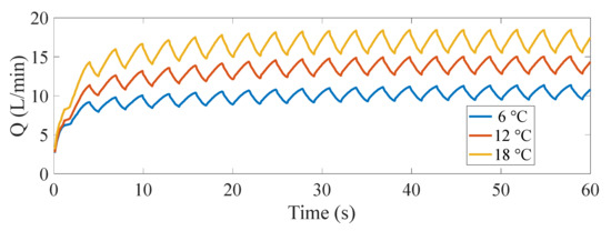 The flow differences of the hydraulic PTO system at different temperatures in the start-up process are shown in Figure 5. The tested system flow is higher when the temperature is higher, close to the simulation results. Hence, within a certain temperature range, the higher the temperature the hydraulic oil is at the startup process, the greater the system flow rate will be.