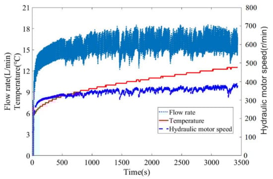 Since the output power of the PTO system at low temperature was much lower than at slightly higher temperatures, a long-running test was carried out at the temperature of 6 °C, controlling the input force constant and using the sensors and meters to record the system state data at runtime. The test results are shown in Figure 9 and Figure 10. It can be seen that when the device was started, the temperature gradually rose, while the hydraulic motor speed, system flow, and pressure rose rapidly. Then, the temperature continued to rise, and when the system pressure was consistent, the system flow, speed, and torque of the hydraulic motor continued to increase. The rise in temperature reduced the viscosity and the flow resistance of the hydraulic oil, while the torque loss of the hydraulic motor decreased, which would eventually increase the mechanical efficiency of the system. Then, 6 minutes later, the temperature of the hydraulic oil continued to rise and eventually reached about 13 °C; the pressure fluctuated slightly. The fluctuations in flow rate and hydraulic motor speed were more obvious. The continuous rise of temperature caused the viscosity of the hydraulic oil to be too low, leading to an increase in leakage, and finally, the volumetric efficiency of the hydraulic PTO system decreased.