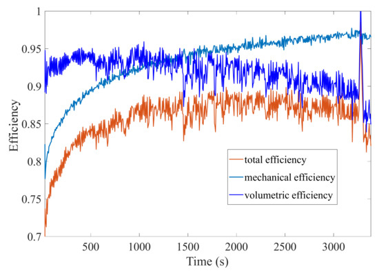 The changes in the mechanical efficiency and volumetric efficiency of the hydraulic motor with the operation of the PTO system are shown in Figure 11. The increase in the temperature of the hydraulic oil caused the mechanical efficiency to rise from about 80 percent to 97 percent, while the volumetric efficiency had a downward trend decreasing from around 93 percent to 85 percent. The total efficiency of the hydraulic motor shows a tendency that it increases firstly and then decreases, and the overall efficiency is maintained at the range of 70 percent to 88 percent.