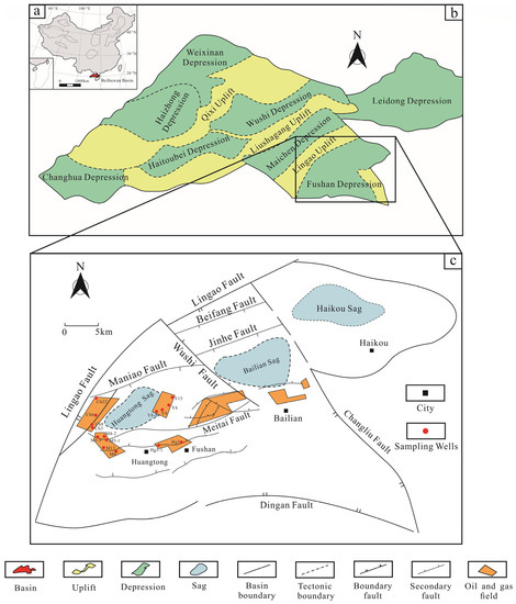 The schematic geological map of the Huangtong Sag and sample position. (a) Location of the Beibuwan Basin. (b) Location of the Fushan Depression. (c) Location of the sampling wells in the Fushan Depression.