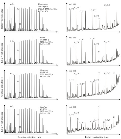 - Xiao, H.; Wang, T.G.; Li, M.J.; Fu, J.; Tang, Y.J.; Shi, S.B.; Yang, Z.; Lu, X.L. Occurrence and Distribution of Unusual Tri- and Tetracyclic Terpanes and Their Geochemical Significance in Some Paleogene Oils from China. Energy Fuels 2018, 32, 7393–7403. [Google Scholar] [CrossRef]