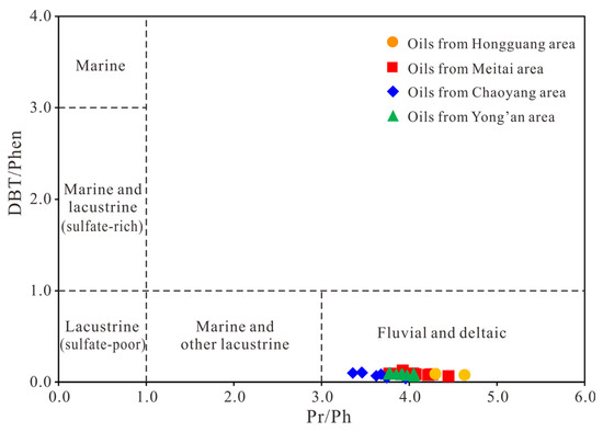 25]. All the samples in this study had relatively high contents of pristane relative to phytane, with ratios ranging from 3.36 to 4.43 (average 3.93) which suggests that the source rocks were deposited in an oxidizing environment. Similarly, in the cross-plot of dibenzothiophene/phenanthrene (DBT/Phen) to Pr/Ph (