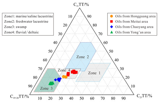 23TT values ranging from 4.47 to 5.51, which suggests a high input of terrigenous higher plant material in the source rocks. Oils from the Meitai and Hongguang areas have a similar distribution of TTs, with relatively lower contents of C