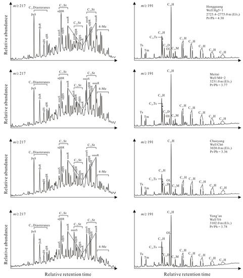 20]. However, the biomarker compositions of the different crude oils were not reported. Precise timings of hydrocarbon accumulation episodes and oil migration orientations have not yet been determined for any part of the Huangtong Sag.