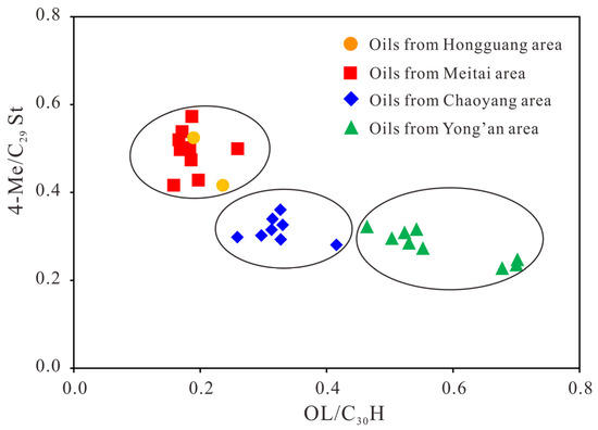 A cross-plot of 4-Me/C29 sterane (4-Me/C29St) vs. oleanane/C30 hopane (OL/C30H) showing the oil family classification in the Huangtong Sag.