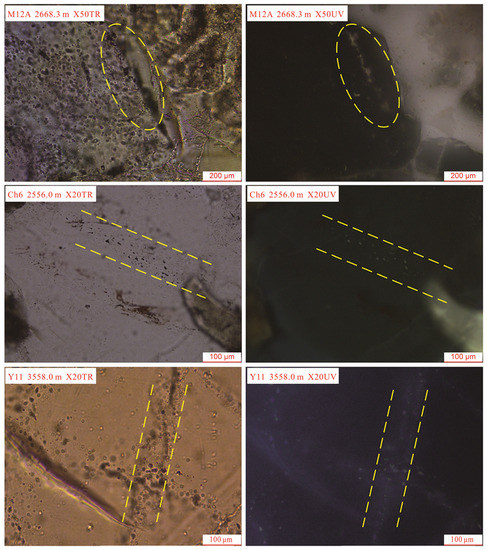 Fluid inclusion observation was performed on the samples using a Leica polarization-fluorescence microscope with a fluorescence photometer (using UV excitation). Homogenization temperature measurements were carried out using the heating-freezing stage of a Linkham Model THMSG 600. The temperature was increased from 24 °C (room temperature) to homogenization temperature (Th) at 5 °C/min and then held at Th for 1 min for temperature measurement. The measurement error was ±1 °C. Since the Th of hydrocarbon inclusions is generally lower than the actual trapping temperatures, the homogenization temperatures of brine inclusions associated with the oil-bearing inclusions were also measured.