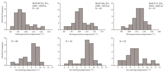 Thirteen sandstone core samples from the Els1 and Els3 reservoirs were polished for fluid inclusion observation and homogenization temperature measurement. These oil sand samples were collected from wells M12A, Ch6, and Y11, which were distributed in Meitai, Chaoyang, and Yong’an oilfields, respectively.