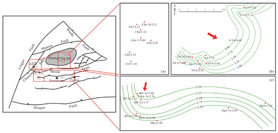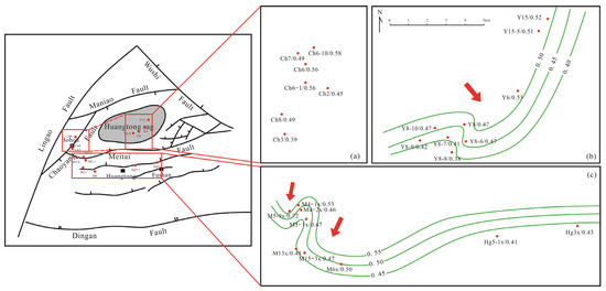 Isopleth map of 4-/1-MDBT of oils showing the oil migration orientation and charging pathways in the Chaoyang area (a), Yong’an area (b) and Hongguang-Meitai area (c). Note: MDBT, methyldibenzothiophene.