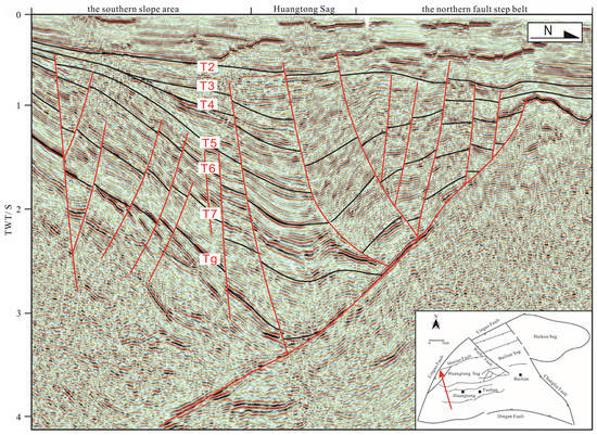 Interpreted seismic section (S-N direction) showing the consequent fault in the Chaoyang area.