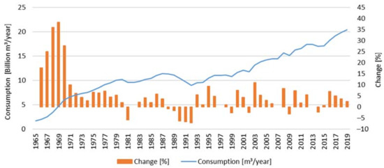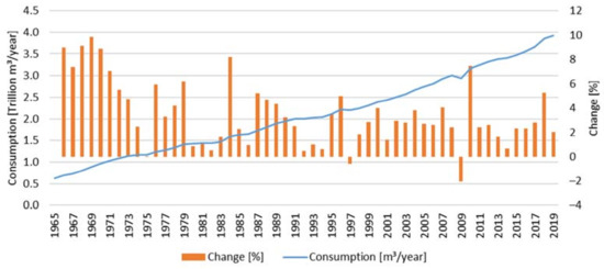 Natural gas is an important raw material in the sustainable energy policy due to its growing importance in the global economy [1,2]. The global economy has observed a continuous growth of natural gas consumption since the 1960s, with a growth rate of 3.5% over the last five years. In 2019, 3.92 trillion m3 of natural gas were consumed worldwide (Figure 1). Poland also shows an upward trend in the consumption of natural gas. The largest decrease was recorded in the period of political transition from 1987–1992 (Figure 2). Natural gas accounts for 36.2% of overall household energy consumption in the EU, ranking first. The share of natural gas consumption in Poland, however, is 18.4%, just behind coal consumption, which amounts to 32.3% [3]. Construction of new natural gas facilities is being considered. These would play a transitional role in the process of energy transformation towards the widest possible use of RES, which is referred to in the drafted EU energy policy and national energy development scenarios. The extent to which natural gas is used in the power industry will depend, among others, on the price of this fuel and on the prices of carbon dioxide emission allowances [4,5,6]. In the case of Europe, the risk of stagnation is observed. This is caused by a drop in consumption and restrictions regarding investments in gas-fuelled power plants and gas infrastructure development since infrastructure is not operating to its maximum capacity [7].