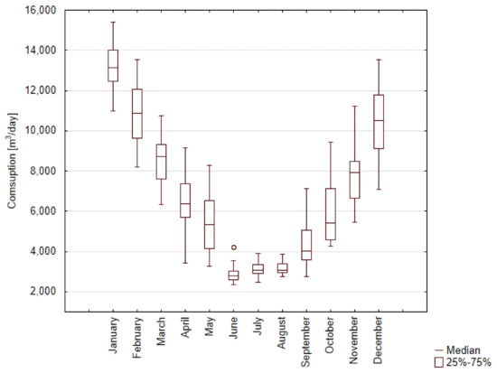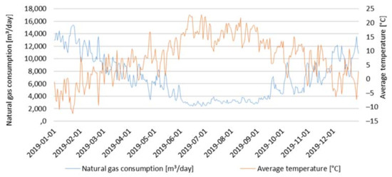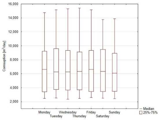 Periods with the highest consumption are the winter months, such as January, February, and March as well as November and December. However, when considering gas consumption on a weekly basis, a slight drop can be observed on weekends (Figure 4 and Figure 5).