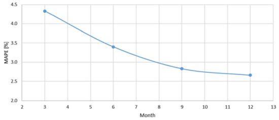 When conducting neural network calculations to find the best model, the following activation functions were checked for the input layer: linear, logistic, tangentoid, and exponential. The same functions were used for the output layer neurons. The Broyden−Fletcher−Goldfarb−Shanno (BFGS) algorithm was used for the calculations. First, the effect of data quantity on the model quality was calculated. The models used learning data from three, six, nine, and twelve months. The larger the learning data set, the smaller the MAPE error (Figure 6).